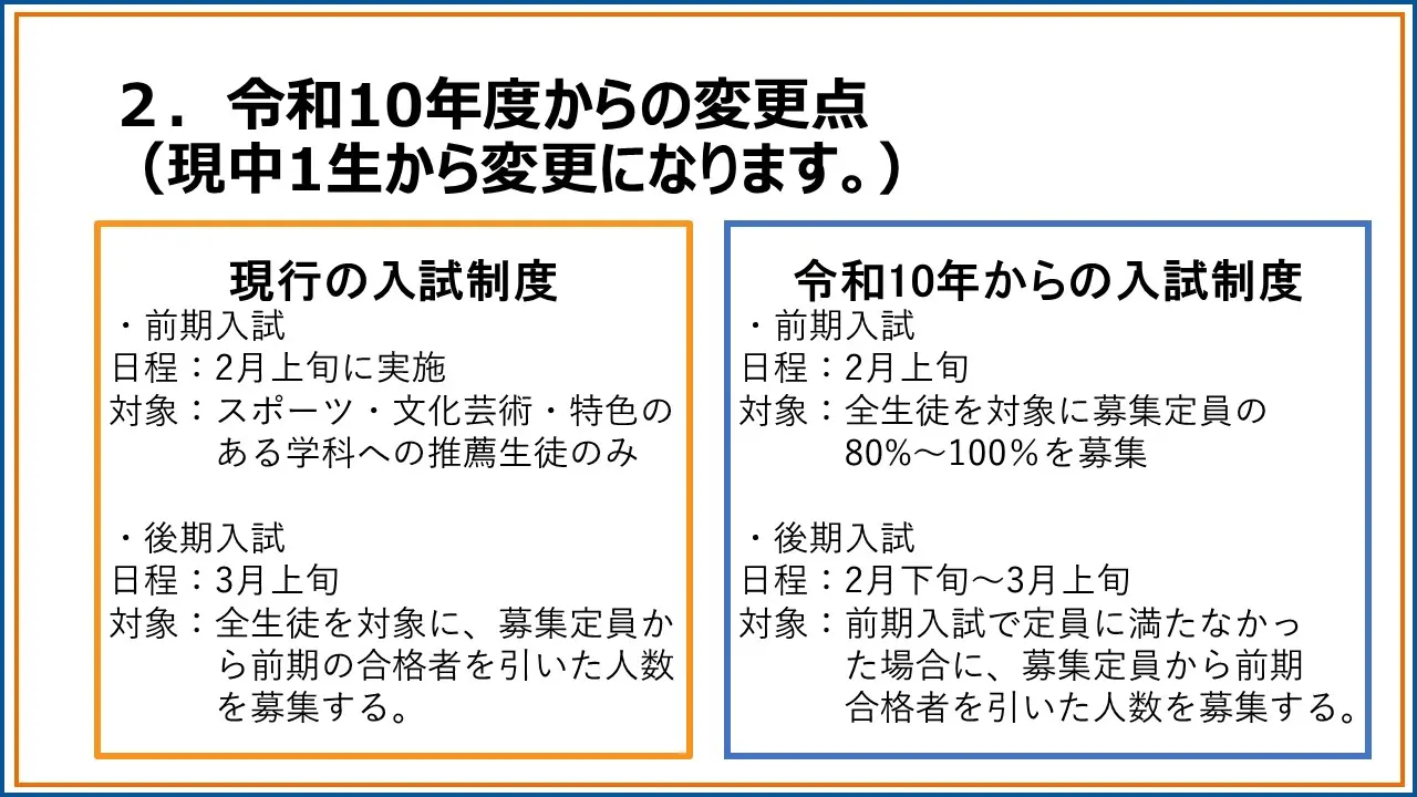 また、公立高校でも2028年度から新たな入試制度に変わるように発表が行われました。来年の2027年度までは既存の入試制度で実施され、前期入試では推薦を受ける生徒のみが対象で、主に後期入試の学力試験を受けて選抜が行われます。
