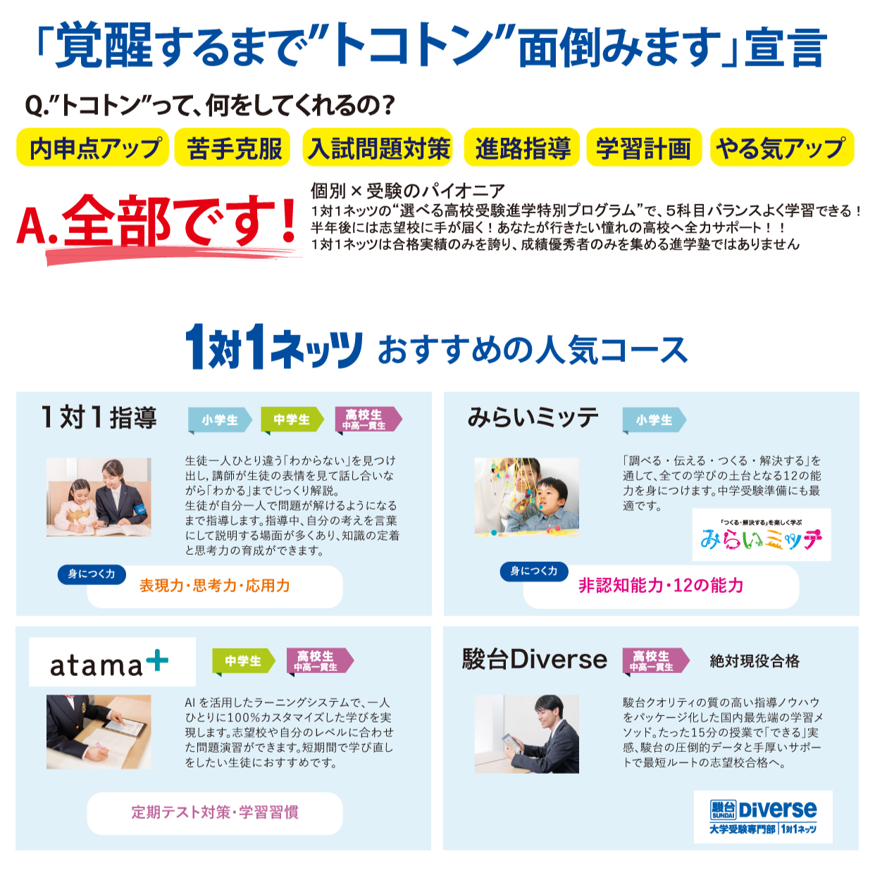 算数・数学の“つまずき”を対話でほどき、「もっとできるはず!」という気持ちにしっかり応えるのが1対1ネッツです。1対1指導体験・内申点対策演習講座は無料で体験できます!